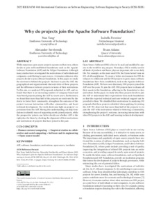While numerous open source projects operate on their own, others decide to join well-established foundations such as the Apache Software Foundation (ASF) and the Eclipse Foundation. Although many studies have investigated the motivations of individuals and companies contributing to open source, it remains unknown why projects decide to join software foundations. In this paper, we study the motivators behind the projects‘ decision to join the ASF, the geographical and organizational characteristics of these projects, and the differences between projects in terms of their motivations. To this aim, we analyzed 292 proposals submitted to ASF, and we found that there is an increasing number of company-based and Asia-based projects joining the ASF in recent years. Furthermore, we found that more than half of the projects are motivated by the desire to foster their community, strengthen the outcome of the project, increase interaction with other communities, and boost technical development. Our work shed some light on projects‘ expectations from the ASF. Having this understanding can help foundations to identify ways of supporting newly joined projects, while the prospective joiners can better decide on whether ASF is the right place for them by checking the alignment of their motivations and motivations of projects that have joined in the past. Open Source Software (OSS) is free to be used and modified by any-one in the world for any purpose. Nowadays, OSS is widely used in all kinds of products and hence plays an important role in our daily life. For example, as the most used OSS, the Linux kernel runs on 85% of all smartphones. To create a better environment for OSS de-velopers to collaborate and for OSS projects to grow, many software foundations have been established, such as the Apache Software Foundation (ASF). We have seen that many OSS projects joined the ASF over the years. To join the ASF, OSS projects have to donate all their assets to the foundation, adhering to the foundation's rules and culture. In this paper, we study why these projects decide to join the ASF to understand their expectations from such foundations so that the expected technical and non-technical support can be provided to them. We identified their motivations by analyzing 292 proposals that these projects submitted when applying for joining the ASF. We observed that more than half of the projects try to join the ASF with motivations related to fostering a community, strengthening the project's outcome, increasing interactions with other OSS projects in the ASF, and boosting technical development.