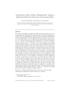 We develop and implement a high-order finite element formulation to solve incompressible shear thinning flows using power-law and Carreau rheology models. We verify the implementation using the Method of Manufactured Solutions (MMS) and demonstrate that the implementation preserves the order of accuracy of the FEM scheme. We run high-order flow-past-a-sphere simulations for Re \(\in [0.1, 100]\) for Newtonian and shear thinning flows. Power-law simulations cover \(n \in [0.3, 0.9]\), Carreau simulations cover the same range of n and dimensionless relaxation times \(\Lambda \in [0.1, 100]\). We use 3D Cartesian grids, adopting a high-order sharp-interface immersed boundary method (IBM) to impose the no-slip boundary condition on the surface of the sphere. We use dynamic mesh adaptation with a Kelly error estimator to adaptively refine the grid. Newtonian drag coefficients are compared to Clift et al.’s model. Using the power-law model for shear thinning flow, results show that when decreasing n : the drag coefficient increases for Re ⪅ 5, it decreases for Re ⪆ 5, and that for higher Reynolds the wake region is longer and the separation point is moved upstream. These drag coefficient results are in adequation with previously established simulation results. We provide a new drag coefficient correlation for power-law fluids that is valid for a wide range of n and for Re \(\in [0.1, 100]\), with \(R^2 = 0.998\). The power-law model is singular in the zero-shear limit, and this limit is bound to occur in a flow-past-a-sphere geometry. For that matter, the Carreau model is well-posed. As the Carreau-modeled results show, the drag force on the sphere is considerably affected by the initial Newtonian plateau of the fluid. Drag coefficient results in the creeping flow regime are compared to experimental results, allowing validation of the numerical model. This work provides a better understanding of shear thinning flow past a sphere, for which the relationship between drag and flow regimes are highly nonlinear.