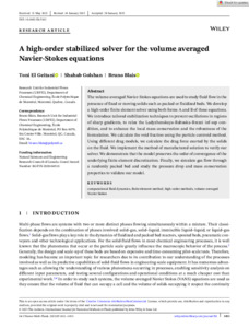 The volume-averaged Navier-Stokes equations are used to study fluid flow in the presence of fixed or moving solids such as packed or fluidized beds. We develop a high-order finite element solver using both forms A and B of these equations. We introduce tailored stabilization techniques to prevent oscillations in regions of sharp gradients, to relax the Ladyzhenskaya–Babuska–Brezzi inf-sup condition, and to enhance the local mass conservation and the robustness of the formulation. We calculate the void fraction using the particle centroid method. Using different drag models, we calculate the drag force exerted by the solids on the fluid. We implement the method of manufactured solution to verify our solver. We demonstrate that the model preserves the order of convergence of the underlying finite element discretization. Finally, we simulate gas flow through a randomly packed bed and study the pressure drop and mass conservation properties to validate our model.