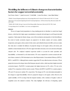 he use of copper-based preparations is a long-standing practice in viticulture to control vine fungal diseases, which has led to high copper concentrations in vineyard soils and impacts on off-target terrestrial organisms. Under projected climate change, some of the mechanisms and properties of soils that influence the extent of metals ecotoxicity impacts are projected to be altered, namely soil erosion, rainfall, temperature, and organic carbon content. In this context, and within the framework of life cycle assessment, this study aims to simulate the influence of projected changes in soil organic carbon, soil erosion, and rainfall on characterization factors (CFs) for copper terrestrial ecotoxicity across non-calcareous European vineyard soils. We employed empirical regression models to account for metal speciation and bioavailability as determined by soil characteristics. CFs were computed for a current scenario and mid-term future scenarios by 2050 determined across three Representative Concentration Pathways (RCP2.6, RCP4.5, and RCP8.5). Although future scenarios suggest that CFs may either increase or decrease, CFs are projected to increase for a larger share of the European vineyard surface, which may lead to higher terrestrial ecotoxicity impacts. The RCP4.5 scenario projects the highest increases in CFs, with a 27% rise in the median CF in comparison with the current scenario. Whereas the RCP8.5 and RCP2.6 scenarios project a 19% and 14% increase in median CFs, respectively. The changes in CFs were determined principally by the changes in copper bioavailability driven by projected changes in soil organic carbon. However, the spatial variability of CFs was larger than the temporal variation, with a variation of roughly 2 orders of magnitude across the analyzed scenarios. This study highlights the relevance of integrating spatial differentiation and the influence of projected climate change in the characterization modelling of copper terrestrial ecotoxicity.