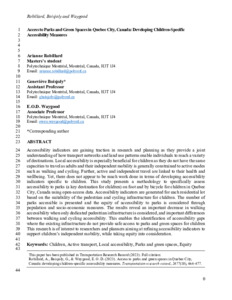 Accessibility indicators are gaining traction in research and planning as they provide a joint understanding of how transportnetworks and land-use patterns enable individuals to reach a variety of destinations. Local accessibility is especially beneficialfor children as they do not have the same capacities to travel as adults and their independent mobility is generally constrainedto active modes such as walking and cycling. Further, active and independent travel are linked to their health and well-being.Yet, there does not appear to have been much work done in relation to developing accessibility indicators specific to children.This study presents a methodology to specifically assess accessibility to parks (a key destination for children) on foot and bybicycle for children in Quebec City, Canada using open-access data. Accessibility indicators were generated for each residen-tial lot based on the suitability of the pedestrian and cycling infrastructure for children. The number of parks accessible waspresented and the equity of accessibility to parks was considered through population and socioeconomic measures. Theresults revealed a notable decrease in walking accessibility when only dedicated pedestrian infrastructure was considered,and differences between walking and cycling accessibility. This enabled the identification of accessibility gaps where the exist-ing infrastructure did not provide safe access to parks and green spaces for children This research will be of interest toresearchers and planners aiming to refine accessibility indicators to support children’s independent mobility, while takingequity into consideration.