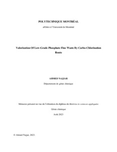 | Citer en APA 7: | Najjar, A. (2023). Valorization of Low-Grade Phosphate Fine Waste by Carbo-Chlorination Route [Mémoire de maîtrise, Polytechnique Montréal]. PolyPublie. https://publications.polymtl.ca/55225/ |