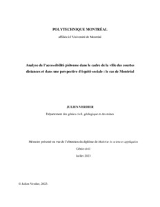 | Citer en APA 7: | Verdier, J. (2023). Analyse de l'accessibilité piétonne dans le cadre de la ville des courtes distances et dans une perspective d'équité sociale : le cas de Montréal [Mémoire de maîtrise, Polytechnique Montréal]. PolyPublie. https://publications.polymtl.ca/55743/ |