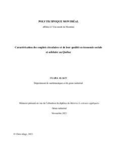 | Citer en APA 7: | Alagy, C. (2023). Caractérisation des emplois circulaires et de leur qualité en économie sociale et solidaire au Québec [Mémoire de maîtrise, Polytechnique Montréal]. PolyPublie. https://publications.polymtl.ca/56733/ |