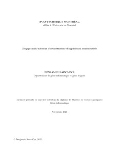 | Citer en APA 7: | Saint-Cyr, B. (2023). Traçage multi-niveaux d'orchestrateur d'application conteneurisée [Mémoire de maîtrise, Polytechnique Montréal]. PolyPublie. https://publications.polymtl.ca/56735/ |