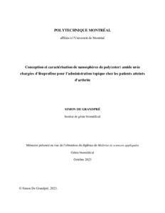 | Citer en APA 7: | De Grandpré, S. (2023). Conception et caractérisation de nanosphères de poly(ester) amide urée chargées d'ibuprofène pour l'administration topique chez les patients atteints d'arthrite [Mémoire de maîtrise, Polytechnique Montréal]. PolyPublie. https://publications.polymtl.ca/57004/ |