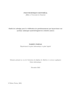| Citer en APA 7: | Portas, F. (2023). Outils de codesign pour la vérification de partitionnement par hyperviseur sur système embarqué matériel-logiciel de criticités mixtes [Mémoire de maîtrise, Polytechnique Montréal]. PolyPublie. https://publications.polymtl.ca/57015/ |