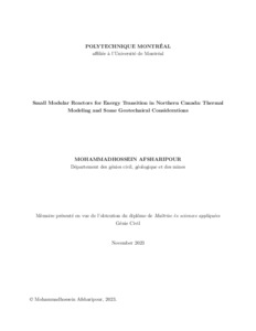 | Citer en APA 7: | Afsharipour, M. (2023). Small Modular Reactors for Energy Transition in Northern Canada: Thermal Modeling and Some Geotechnical Considerations [Mémoire de maîtrise, Polytechnique Montréal]. PolyPublie. https://publications.polymtl.ca/57047/ |