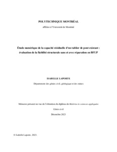 | Citer en APA 7: | Laporte, I. (2023). Étude numérique de la capacité résiduelle d'un tablier de pont existant : évaluation de la fiabilité structurale sans et avec réparation en BFUP [Mémoire de maîtrise, Polytechnique Montréal]. PolyPublie. https://publications.polymtl.ca/57061/ |