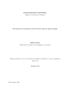 | Citer en APA 7: | Raad, R. (2023). Prévention de la formation d'ocre ferreuse dans les drains français [Mémoire de maîtrise, Polytechnique Montréal]. PolyPublie. https://publications.polymtl.ca/57087/ |