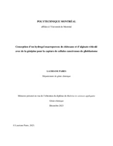 | Citer en APA 7: | Pares, L. (2023). Conception d'un hydrogel macroporeux de chitosane et d'alginate réticulé avec de la génipine pour la capture de cellules cancéreuses de glioblastome [Mémoire de maîtrise, Polytechnique Montréal]. PolyPublie. https://publications.polymtl.ca/57112/ |