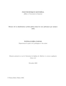 | Citer en APA 7: | Dahak, F.-Z. (2023). Mesure de la cohabitation cycliste-piéton dans les rues piétonnes par analyse vidéo [Mémoire de maîtrise, Polytechnique Montréal]. PolyPublie. https://publications.polymtl.ca/57131/ |