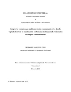| Citer en APA 7: | Cisse, M. K. (2023). Intégrer les connaissances traditionnelles des communautés cries dans la végétalisation tout en maintenant la performance technique de la restauration sur un parc à résidus miniers [Thèse de doctorat, Polytechnique Montréal]. PolyPublie. https://publications.polymtl.ca/57134/ |