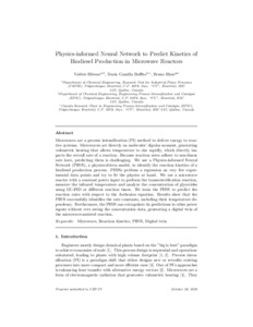 Microwaves are a process intensification (PI) method to deliver energy to reactive systems. Microwaves act directly on molecules’ dipolar moment, generating volumetric heating that allows temperature to rise rapidly, which directly impacts the overall rate of a reaction. Because reaction rates adhere to non-linear rate laws, predicting them is challenging. We use a Physics-informed Neural Network (PINN), a physics-driven model, to identify the reaction kinetics of a biodiesel production process. PINNs perform a regression on very few experimental data points and try to fit the physics at hand. We use a microwave reactor with a constant power input to perform the transesterification reaction, measure the infrared temperature and analyze the concentration of glycerides using GC-FID at different reaction times. We train the PINN to predict the reaction rates with respect to the Arrhenius equation. Results show that the PINN successfully identifies the rate constants, including their temperature dependency. Furthermore, the PINN can extrapolate its predictions to other power inputs without ever seeing the concentration data, generating a digital twin of the microwave-assisted reaction.