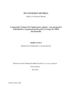 | Citer en APA 7: | Lechat, P. (2024). Comprendre l'impact de l'impuissance apprise : une perspective individuelle et organisationnelle grâce à l'usage de l'IRM fonctionnelle [Mémoire de maîtrise, Polytechnique Montréal]. PolyPublie. https://publications.polymtl.ca/57726/ |