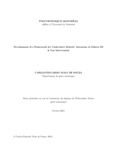 | Citer en APA 7: | Maia De Souza, C. E. (2024). Development of Framework for Underwater Robotic Autonomy in Subsea oil & Gas Intervention [Thèse de doctorat, Polytechnique Montréal]. PolyPublie. https://publications.polymtl.ca/58008/ |