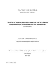 | Citer en APA 7: | Adam, L. F. F. (2024). Valorisation des données de maintenance extraites d'un ERP : développement d'un modèle utilisant l'intelligence artificielle pour la prédiction des consommations [Mémoire de maîtrise, Polytechnique Montréal]. PolyPublie. https://publications.polymtl.ca/58315/ |
