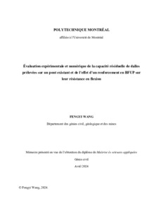 | Citer en APA 7: | Wang, F. (2024). Évaluation expérimentale et numérique de la capacité résiduelle de dalles prélevées sur un pont existant et de l'effet d'un renforcement en BFUP sur leur résistance en flexion [Mémoire de maîtrise, Polytechnique Montréal]. PolyPublie. https://publications.polymtl.ca/58334/ |