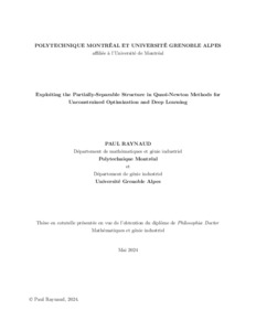 Cette thèse explore l’utilisation de la structure partiellement-séparable pour l’optimisation continue sans contrainte, en particulier pour les méthodes quasi-Newton et l’entraînement de réseaux de neurones. Une fonction partiellement-séparable est la somme de fonctions éléments, chacune de dimension inférieure à celle du problème total. Le Hessien peut être agrégé en approximant séparément le Hessien de chaque fonction élément avec une matrice dense. Cela préserve la structure creuse du Hessien, contrairement aux méthodes quasi-Newton à mémoire limitée. En pratique, ces méthodes nécessitent moins d’itérations qu’une méthode quasi-Newton à mémoire limitée et peuvent être parallélisées en distribuant les calculs liés aux fonctions éléments. Cependant, la revue de littérature de la thèse révèle certaines limites lorsque la dimension des fonctions éléments est grande. De plus, le seul logiciel d’optimisation libre exploitant la structure partiellement-séparable est inutilisable pour les utilisateurs inexpérimentés sans l’utilisation d’un langage de modélisation commercial. Dans cette thèse, des solutions sont proposées pour remédier à ces lacunes, ainsi qu’une application des concepts d’optimisation partiellement-séparable à l’apprentissage supervisé d’un réseau de neurones. La première contribution est une suite logicielle libre basée sur une détection automatique de la structure partiellement-séparable d’un problème, c’est-à-dire qu’elle retrouve chaque fonction élément de dimension réduite. Elle alloue des structures de données partitionnées nécessaires pour stocker les dérivées (approximées) et définit des méthodes d’optimisation quasi-Newton (à mémoire limitée) partitionnées. L’ensemble de la suite est intégré à l’écosystème JuliaSmoothOptimizers, qui rassemble de nombreux outils pour l’optimisation continue, notamment des algorithmes d’optimisation qui peuvent exploiter la séparabilité partielle détectée. Dans la deuxième contribution, l’approximation d’un Hessien élément par une matrice dense est remplacée par un opérateur linéaire quasi-Newton à mémoire limitée. Par conséquent, le coût en mémoire pour stocker et effectuer un produit entre l’approximation du Hessien et un vecteur n’est plus quadratiquement lié à la dimension des fonctions éléments. Une telle approximation partitionnée à mémoire limitée est alors applicable lorsque les fonctions éléments sont grandes, contrairement à une approximation partitionnée dense. La norme de chaque nouvel opérateur quasi-Newton partitionné à mémoire limitée peut être bornée, garantissant que sa méthode de région de confiance relative converge. De plus, les résultats numériques montrent que ces méthodes surpassent les méthodes quasi-Newton partitionnées ou à mémoire limitée lorsque les fonctions éléments sont larges. La dernière contribution examine l’exploitation de la structure partiellement-séparable dans l’entraînement supervisé d’un réseau de neurones. En général, le problème d’optimisation associé à l’entraînement n’est pas partiellement-séparable. Par conséquent, une fonction de perte partiellement-séparable et une architecture de réseau de neurones partitionnée sont introduites pour rendre l’entraînement partiellement-séparable. Les résultats numériques montrent qu’une combinaison de ces deux contributions est compétitive avec les architectures et fonctions de perte usuelles. L’entraînement de cette combinaison peut être réalisé en parallèle, de manière complémentaire aux techniques d’apprentissage supervisé parallèles existantes. Plus spécifiquement, les calculs de chaque fonction de perte élément peuvent être distribués à un travailleur qui opère uniquement sur un fragment du réseau de neurones. Le problème d’entraînement partiellement-séparable possède des larges éléments pour lesquels un entraînement quasi-Newton partitionné à mémoire limitée est proposé. Cet entraînement est empiriquement montré comme compétitif avec les méthodes d’entraînement de l’état de l’art et légèrement inférieur à Adam.