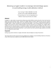 Surrogate (i.e. meta) models can approximate building energy models (BEMs) accurately and quickly, hence they have been widely used in BEM calibration studies. Typically, the surrogate models are trained a single time over the entire unknown building parameter space with a design such as Latin hypercube sampling. In this article, a multiple polynomial regression surrogate model is, instead, retrained with increasingly restricted designs. In each training repetition, the bounds of the design narrow around the unknown building parameter values that minimize the error between the surrogate model’s predictions and the measured energy. This ‘cascading surrogate’ calibration method finds CVRMSE values that are much lower than those of a powerful black box optimizer in a case study with simulated ‘measured’ data. However, the method has similar performance to the black box optimizer in a case study with real hourly measured energy, probably since the BEM was not configured accurately enough.