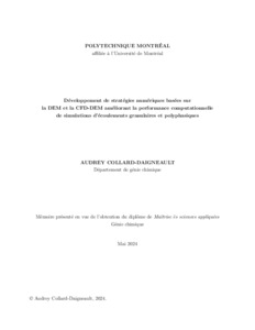 | Citer en APA 7: | Collard-Daigneault, A. (2024). Développement de stratégies numériques basées sur la DEM et la CFD-DEM améliorant la performance computationnelle de simulations d'écoulements granulaires et polyphasiques [Mémoire de maîtrise, Polytechnique Montréal]. PolyPublie. https://publications.polymtl.ca/58593/ |