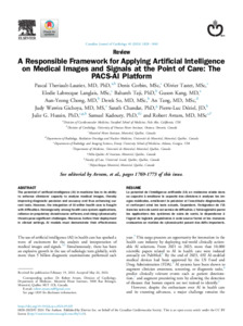| Citer en APA 7: | Thériault-Lauzier, P., Corbin, D., Tastet, O., Langlais, É. L., Taji, B., Kang, G., Chong, A.-Y., So, D., Tang, A., Gichoya, J. W., Anbil Parthipan, S. C., Déziel, P.-L., Hussin, J. G., Kadoury, S., & Avram, R. (2024). A responsible framework for applying artificial intelligence on medical images and signals at the point-of-care: the PACS-AI platform. Canadian Journal of Cardiology, 025 (39 pages). https://doi.org/10.1016/j.cjca.2024.05.025 |