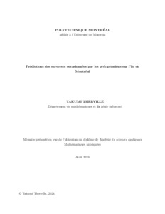 | Citer en APA 7: | Therville, T. (2024). Prédictions des surverses occasionnées par les précipitations sur l'île de Montréal [Mémoire de maîtrise, Polytechnique Montréal]. PolyPublie. https://publications.polymtl.ca/58737/ |