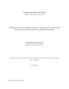 Ce mémoire explore la vérification et caractérisation de processeurs vectoriels multi-coeurs offrant des instructions dédiées aux réseaux de neurones convolutionnels. Cette étude se con- centre sur la vérification de la fonctionnalité du processeur CORE-V Polara et sur l’exploration d’opérations de convolution à faible précision sur MSPARQ, via une émulation FPGA. A travers une méthodologie impliquant l’adaptation du flot de développement FPGA de OpenPiton, du débogage matériel et des tests d’instructions RISC-V, le processeur CORE-V Polara a pu être validé et envoyé en fabrication. Ensuite, en implémentant l’algorithme de convolution 2D ULPPACK sur les multiples coeurs de MSPARQ, l’étude caractérise la performance du processeur en termes d’opérations et d’utilisation de la cache pour différents niveaux de précision. Elle met en évidence des éléments de conception uniques au processeur, incluant de la vectorisation, du paquettage, et des mécanismes de synchronisation, présentant son efficacité dans le traitement d’opérandes de faible précision tout en conservant les caractéristiques d’un processeur à usage général. Les résultats obtenus de l’expérimentation démontrent la faisabilité et l’intérêt d’une telle architecture de processeur pour de multiples applications, notamment les CNNs, en mettant l’accent sur l’efficacité du processeur pour différentes tailles et configurations de problèmes. Ce mémoire souligne l’importance de solutions matérielles sur mesure pour des applications telles que l’inférence de réseaux de neurones dans des environnements où les ressources sont limitées.