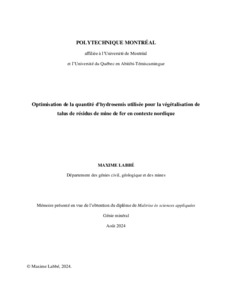 | Citer en APA 7: | Labbé, M. (2024). Optimisation de la quantité d'hydrosemis utilisée pour la végétalisation de talus de résidus de mine de fer en contexte nordique [Mémoire de maîtrise, Polytechnique Montréal]. PolyPublie. https://publications.polymtl.ca/59180/ |