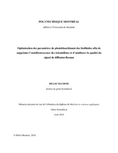 | Citer en APA 7: | Maubois, B. (2024). Optimisation des paramètres de photoblanchiment des biofluides afin de supprimer l'autofluorescence des échantillons et d'améliorer la qualité du signal de diffusion Raman [Mémoire de maîtrise, Polytechnique Montréal]. PolyPublie. https://publications.polymtl.ca/59202/ |