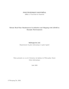| Citer en APA 7: | Du, W. (2024). Robust Real-Time Simultaneous Localization and Mapping with LiDAR in Dynamic Environments [Thèse de doctorat, Polytechnique Montréal]. PolyPublie. https://publications.polymtl.ca/59215/ |