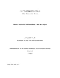 | Citer en APA 7: | Abou Taam, J. (2024). Définir et mesurer la multimodalité de l'offre de transport [Mémoire de maîtrise, Polytechnique Montréal]. PolyPublie. https://publications.polymtl.ca/59279/ |