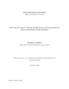 | Citer en APA 7: | Tambon, F. (2024). Who Tests the Testers? Assessing the Effectiveness and Trustworthiness of Deep Learning Model Testing Techniques [Thèse de doctorat, Polytechnique Montréal]. PolyPublie. https://publications.polymtl.ca/59454/ |