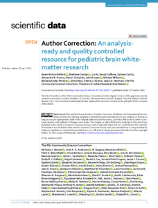 | Citer en APA 7: | Richie-Halford, A., Cieslak, M., Ai, L., Caffarra, S., Covitz, S., Franco, A. R., Karipidis, I. I., Kruper, J., Milham, M. P., Avelar-Pereira, B., Roy, E. R., Sydnor, V. J., Yeatman, J. D., Abbott, N. J., Anderson, J. A. E., Gagana, B., Bleile, M.L., Bloomfield, P. S., Bottom, V., ... Omary, A. (2023). Author Correction: An analysis-ready and quality controlled resource for pediatric brain white-matter research. Scientific Data, 10(1). https://doi.org/10.1038/s41597-023-02137-8 |