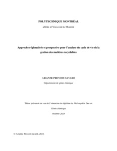 | Citer en APA 7: | Provost-Savard, A. (2024). Approche régionalisée et prospective pour l'analyse du cycle de vie de la gestion des matières recyclables [Thèse de doctorat, Polytechnique Montréal]. PolyPublie. https://publications.polymtl.ca/60245/ |