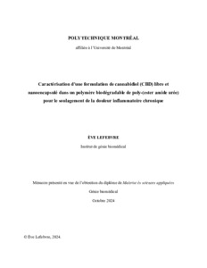 | Citer en APA 7: | Lefebvre, È. (2024). Caractérisation d'une formulation de cannabidiol (CBD) libre et nanoencapsulé dans un polymère biodégradable de poly-(ester amide urée) pour le soulagement de la douleur inflammatoire chronique [Mémoire de maîtrise, Polytechnique Montréal]. PolyPublie. https://publications.polymtl.ca/61097/ |