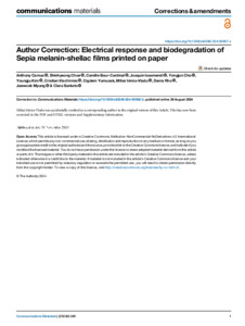 | Citer en APA 7: | Camus, A., Choe, S., Bour-Cardinal, C., Isasmendi, J., Cho, Y.-J., Kim, Y., Irimia, C. V., Yumusak, C., Irimia-Vladu, M., Rho, D., Myung, J., & Santato, C. (2024). Erratum Correction: Electrical response and biodegradation of Sepia melanin-shellac films printed on paper. Communications Materials, 5(1). https://doi.org/10.1038/s43246-024-00687-x |