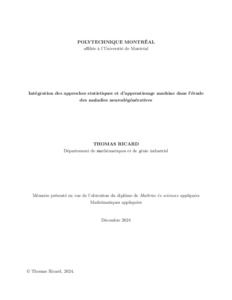 | Citer en APA 7: | Ricard, T. (2024). Intégration des approches statistiques et d'apprentissage machine dans l'étude des maladies neurodégénératives [Mémoire de maîtrise, Polytechnique Montréal]. PolyPublie. https://publications.polymtl.ca/61587/ |