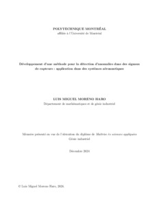 | Citer en APA 7: | Moreno Haro, L. M. (2024). Développement d'une méthode pour la détection d'anomalies dans des signaux de capteurs : application dans des systèmes aéronautiques [Mémoire de maîtrise, Polytechnique Montréal]. PolyPublie. https://publications.polymtl.ca/61636/ |