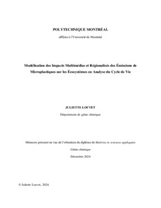 | Citer en APA 7: | Louvet, J. (2024). Modélisation des impacts multimédias et régionalisés des émissions de microplastiques sur les écosystèmes en analyse du cycle de vie [Mémoire de maîtrise, Polytechnique Montréal]. PolyPublie. https://publications.polymtl.ca/61778/ |