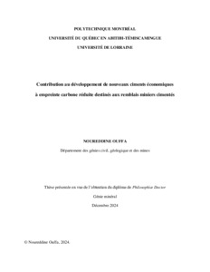 | Citer en APA 7: | Ouffa, N. (2025). Contribution au développement de nouveaux ciments économiques à empreinte carbone réduite destinés aux remblais miniers cimentés [Thèse de doctorat, Polytechnique Montréal]. PolyPublie. https://publications.polymtl.ca/61986/ |