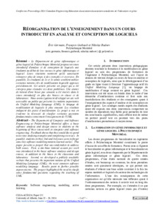 | Citer en APA 7: | Germain, É., Guibault, F., & Radoev, N. (juin 2024). Réorganisation de l'enseignement dans un cours introductif en analyse et conception de logiciels [Reorganization of teaching in an introductory course in software analysis and design]. [Communication écrite]. Canadian Engineering Education Association (CEEA-ACEG 2024), Edmonton, Alberta, Canada (7 pages). Publié dans Proceedings of the Canadian Engineering Education Association (CEEA). https://doi.org/10.24908/pceea.2024.18581 |