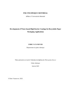 | Citer en APA 7: | Vatansever, E. (2025). Development of Water-Based High Barrier Coatings for Recyclable Paper Packaging Applications [Thèse de doctorat, Polytechnique Montréal]. PolyPublie. https://publications.polymtl.ca/62516/ |