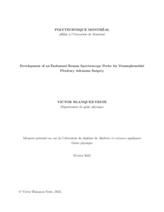 | Citer en APA 7: | Blanquez-Yeste, V. (2025). Development of an Endonasal Raman Spectroscopy Probe for Transsphenoidal Pituitary Adenoma Surgery [Mémoire de maîtrise, Polytechnique Montréal]. PolyPublie. https://publications.polymtl.ca/63028/ |