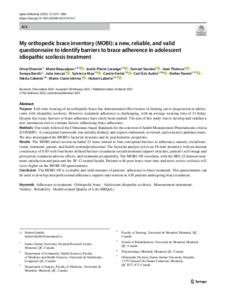 | Citer en APA 7: | Elsemin, O., Beauséjour, M., Lorange, J.-P., Sassine, S., Théroux, J., Barchi, S., Joncas, J., Le May, S., Fortin, C., Aubin, C.-É., Parent, S., Cobetto, N., Ishimo, M.-C., & Labelle, H. (2025). My orthopedic brace inventory (MOBI): a new, reliable, and valid questionnaire to identify barriers to brace adherence in adolescent idiopathic scoliosis treatment. Spine deformity, 13, 1075-1084. https://doi.org/10.1007/s43390-025-01074-3 |