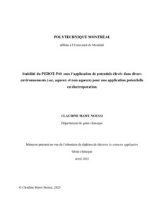 | Citer en APA 7: | Mawe Noussi, C. (2025). Stabilité du PEDOT:PSS sous l'application de potentiels élevés dans divers environnements (sec, aqueux et non aqueux) pour une application potentielle en électroporation [Mémoire de maîtrise, Polytechnique Montréal]. PolyPublie. https://publications.polymtl.ca/64935/ |