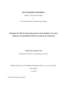 | Citer en APA 7: | Yoni, W. N. (2025). Évaluation de l'effet de l'interaction entre les rejets désulfurés et les rejets sulfureux sur la géochimie du lixiviat en contexte de restauration [Mémoire de maîtrise, Polytechnique Montréal]. PolyPublie. https://publications.polymtl.ca/65546/ |