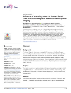 Results We investigated the impact of the acquisition strategy by means of various metrics such as Temporal Signal to Noise Ratio (tSNR), Dice Coefficient to assess geometric distortions, Reproducibility and BOLD signal sensitivity to the stimulus. tSNR was higher in axial than in sagittal scans, as well as reproducibility within the whole cord mask (t = 7.4, p < 0.01) and within the GM mask (t = 4.2, p < 0.01). The other benchmarks, associated with distortion and functional response, showed no difference between images obtained along the axial and sagittal planes.