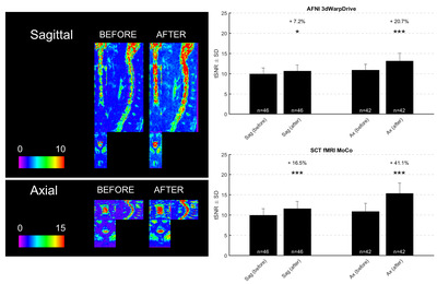 Methods Forty-five healthy subjects underwent MRI acquisition in a Philips Achieva 3T MRI scanner. T2*-weighted fMRI data were acquired using a GE-EPI sequence along sagittal and axial planes during an isometric motor task. Differences on benchmarks were assessed via paired two-sample t-test at p < 0.05.