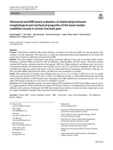Methods The study included 25 participants with chronic nonspecific LBP and 25 age- and sex-matched healthy controls. Participants underwent MRI assessment for MF fat infiltration, utilizing IDEAL fat-water images. Ultrasound measures evaluated MF function, including shear-wave elastography (SWE) for stiffness/elasticity and thickness ratio from rest to submaximal contraction. All measurements were acquired at L4/L5 and L5/S1 spinal levels, bilaterally. Bivariate and multivariable linear regression models were used to assess the relationship between morphology and function, while age, sex, body max index (BMI), physical activity levels, and LBP status were considered as covariates.